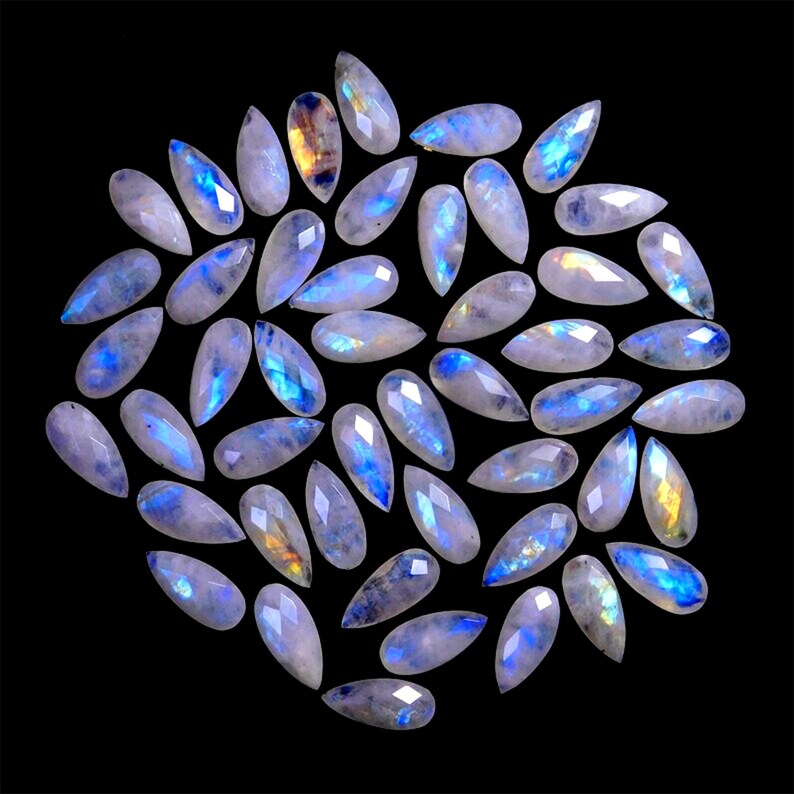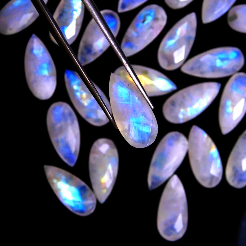 Made from genuine, untreated Rainbow Moonstone, these beads display a beautiful white rainbow glow that varies slightly in each piece due to natural variations. The approximate thickness of 5.5 to 6.5 mm ensures durability while maintaining their delicate, elegant appearance. Whether you're designing necklaces, earrings, or bracelets, these gorgeous faceted briolettes will add a touch of mystical allure to your creations.